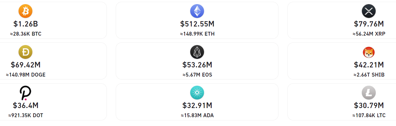 Yesterday saw nearly $3 billion getting liquidated. $1.26 billion of that, as the below image shows, came from Bitcoin trades alone, with Ethereum trades ($515 million), Ripple trades ($80 million), and Dogecoin trades ($69.42 million) trailing in behind.