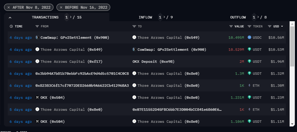 Large movements of Ethereum (ETH), USDT, and USDC can be seen in the image above, transacting between Nov. 9 and Nov. 11. A total of over $20 million in the three crypto assets was moved through OKX and CowSwap during the six-day period.
