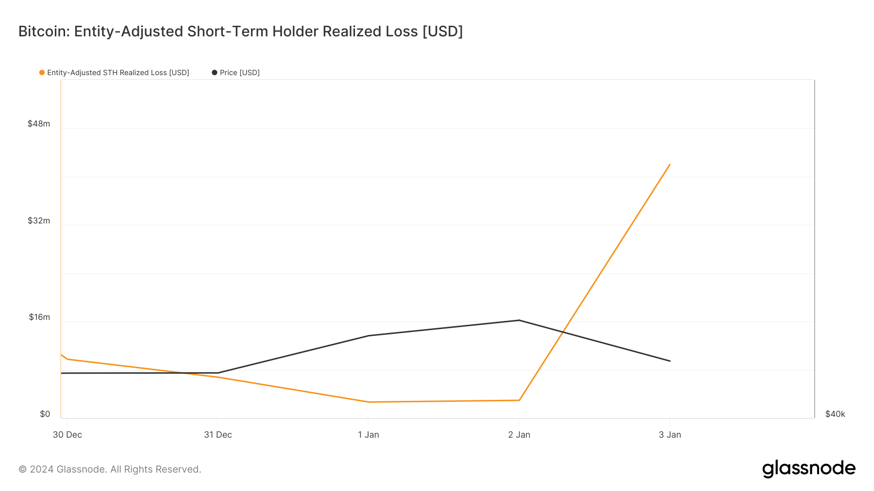 The loss for long-term holders was relatively consistent, remaining at around $5 million on both Jan. 2 and Jan. 3. In contrast, short-term holders experienced a dramatic increase in realized losses. Entity-adjusted short-term holders' realized loss increased from $2.93 million on Jan. 2 to $42 million on Jan. 3.