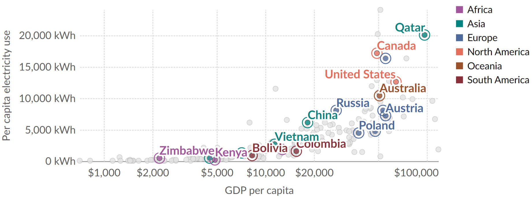 It is safe to say that being a developed nation is strongly correlated with a high energy usage. This is clearly visible if we chart per capita electricity generation in kilowatt-hours (kWh) against a nation’s gross domestic product (GDP).