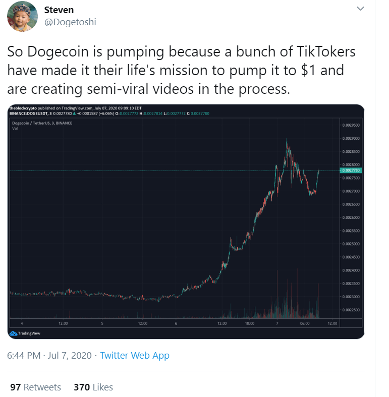 The modus operandi is simple. Buy DOGE until it reaches $1 (the coin trades at $0.002 at press time). If 800 million TikTok users do the same, the investment will be worth over $10,000.