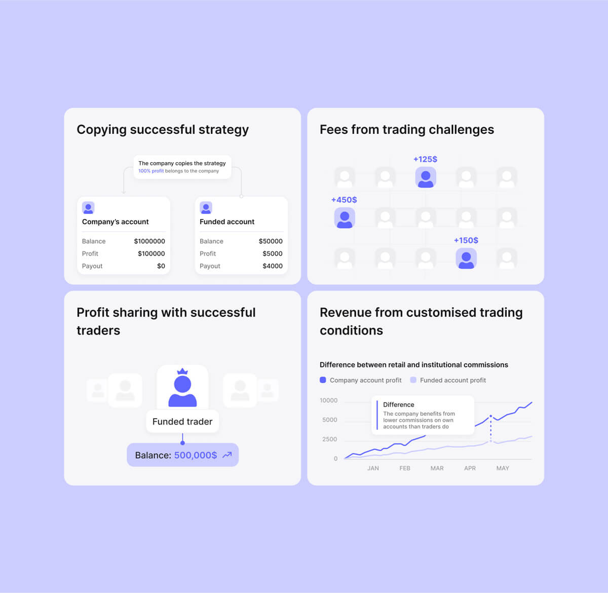 Trading Challenge Fees—Businesses earn by charging participation fees for proprietary trading challenges. Traders can attempt challenges multiple times, increasing company income.