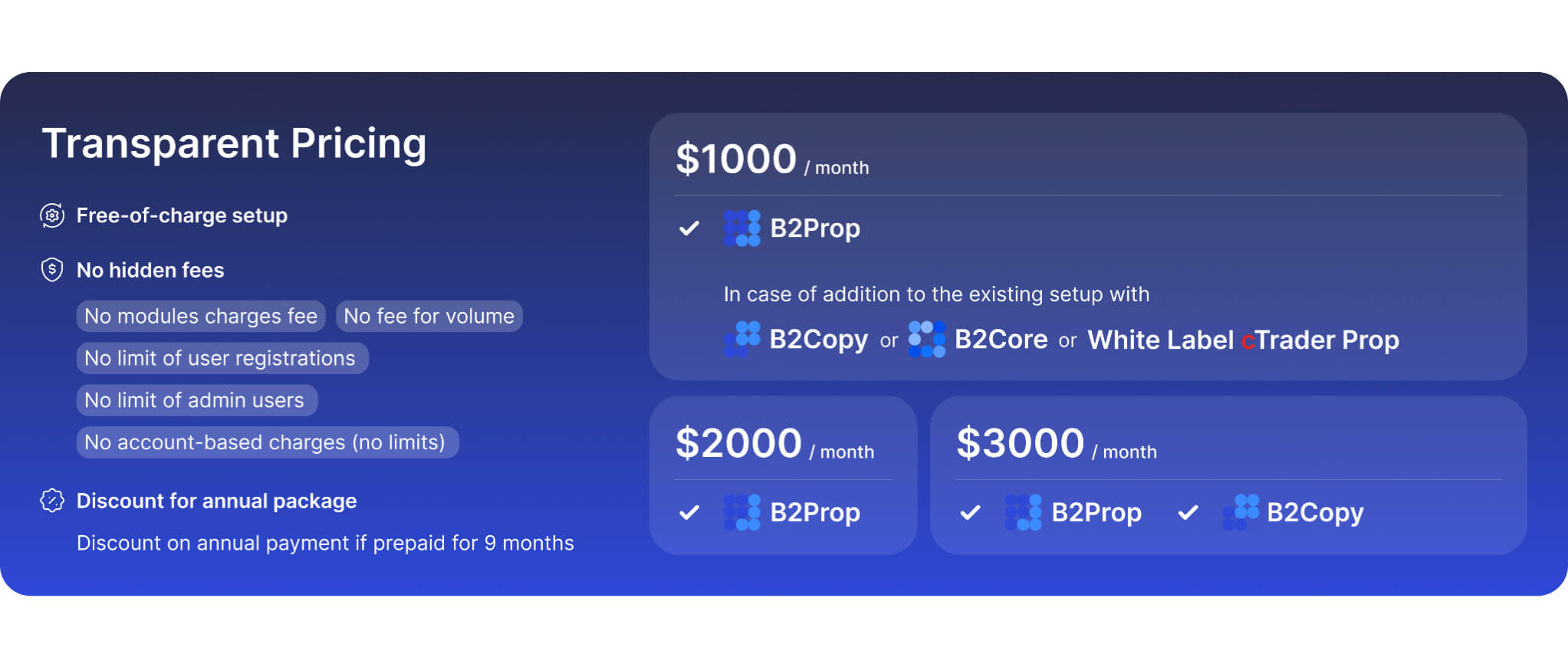 The package also includes the white-label cTrader platform, customised specifically for prop trading brokers. It combines cTrader’s advanced features and functionalities with a cost-effective business deployment model. Also, B2Prop can be integrated with MT4 and MT5 trading software if the business has the licence.