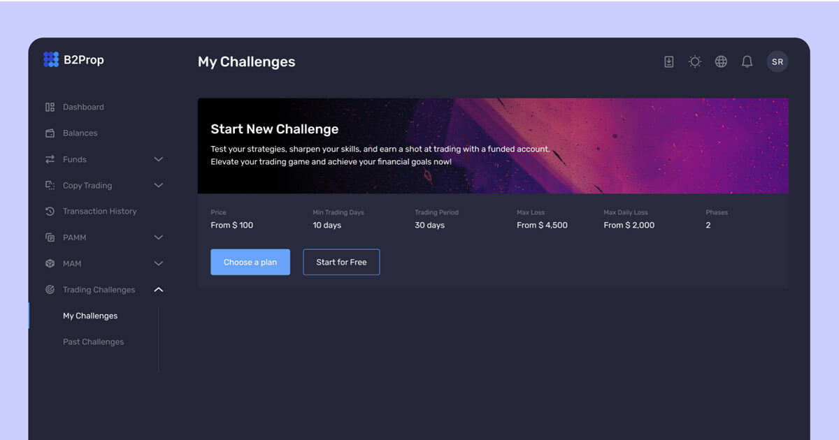 B2Prop is a sophisticated, challenge-based solution for various business types—prop trading firms, crypto and FX brokers, and multi-asset brokerage houses—to expand their portfolio and reach new markets.