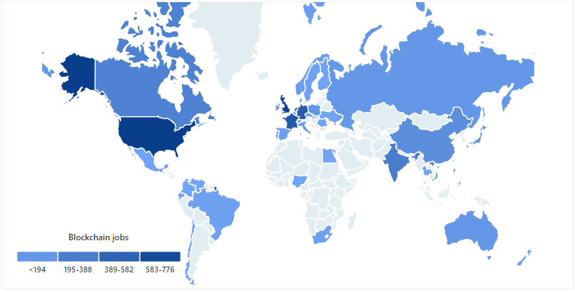 The US is currently ground zero for the blockchain revolution, with more than 1,800 jobs listed in the industry on a daily basis. France, Germany, and the UK are other hotspots of blockchain innovation, followed by the rapidly growing Indian crypto economy.