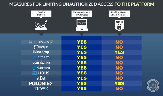 The NY AG notes that all of the platforms that voluntarily provided data to the Virtual Markets Integrity Initiative use IP tracking methods to control access, but only BitStamp and Poloniex block masked VPN/IP addresses.