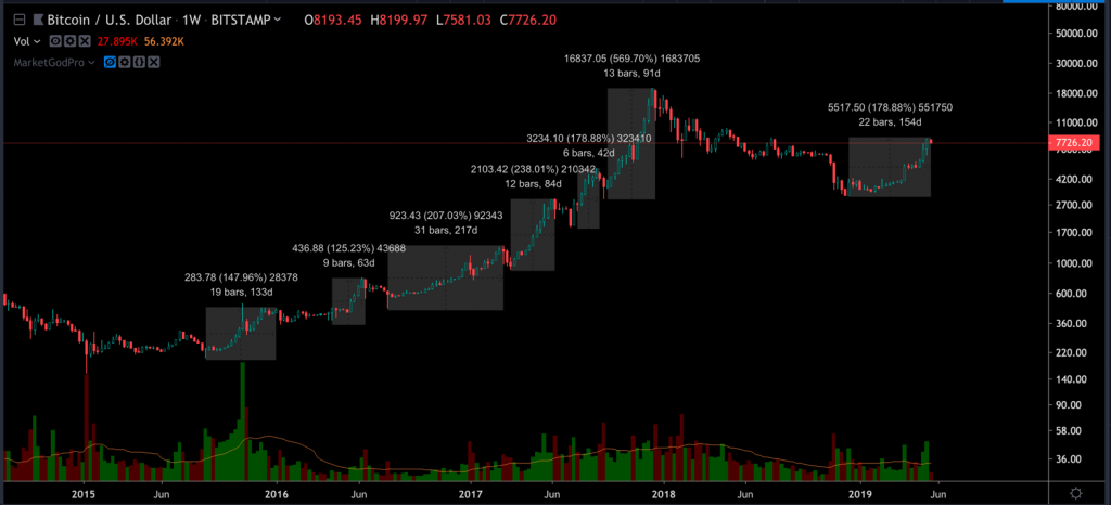 The most recent surge of late February-to-now appears to be in alignment with the previous swings in 2014 to 2017, in which the first two years of price movement to the upside consisted of 100–200 percent surges over 2–3 month periods. Under that logic, it would be entirely possible to see the $5,500 to $6,500 range tested again in the event the potential bull flag were to be invalidated. What to expect if the bull flag is invalidated can be read here.