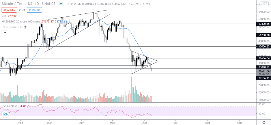 The next possible support where a bounce can be expected is in the $30,200 region. In case the price continues to fall, it is almost certain that we can expect that support level to be hit. $30,000 is a crucial range and the price needs to stay above it.