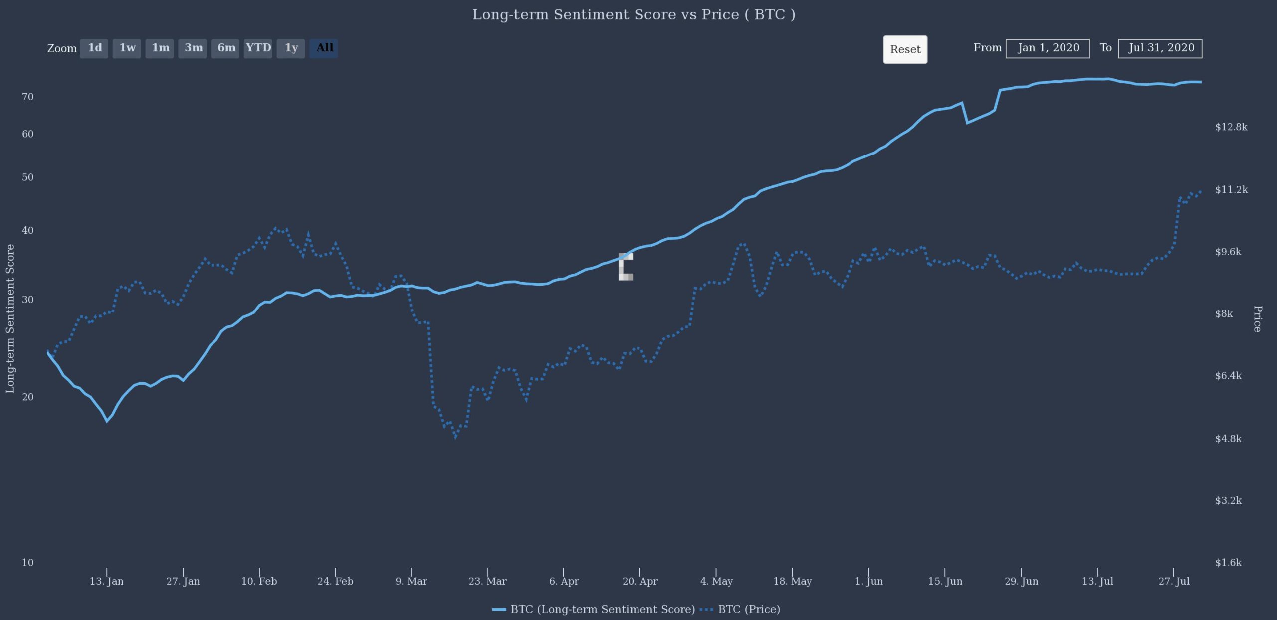 As CryptoSlate reported last week, the long-term public sentiment for Bitcoin remains similarly positive, as data from TheTIE shows: