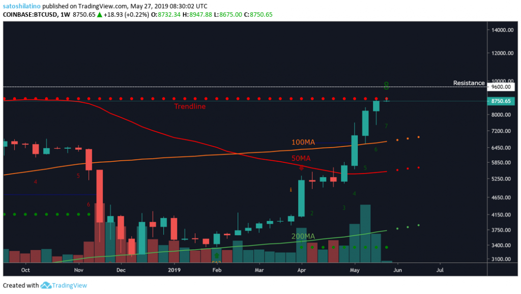 Bitcoin remains bullish across all major charts and it seems to be on its way to the $10,000 pivot point. The 1-week and 3-day charts are giving signs of bullish trend exhaustion, which could indicate that after reaching the next resistance point bitcoin could consolidate once again or correct.