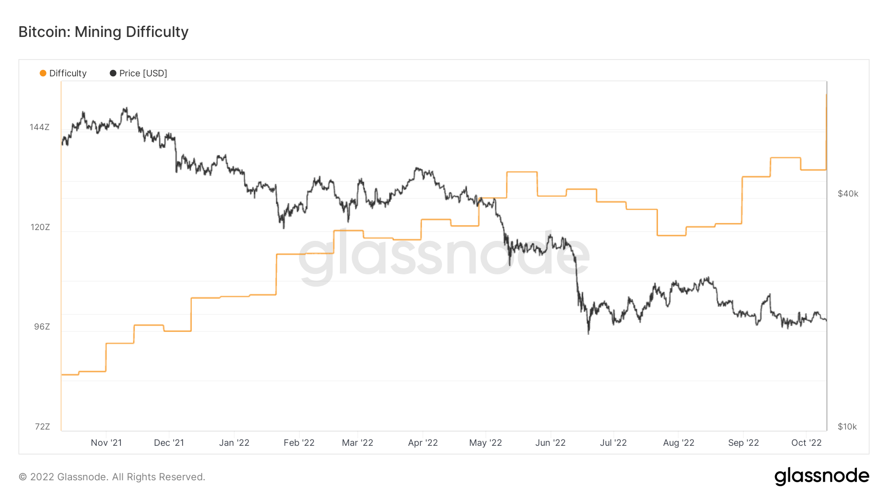 The increase in hash rate follows an equally sharp rise in mining difficulty. On Monday, Oct. 10, Bitcoin mining difficulty saw its sharpest adjustment this year, increasing by 13%. Monday's adjustment puts the current Bitcoin mining difficulty at 2x the levels it recorded in July 2021.