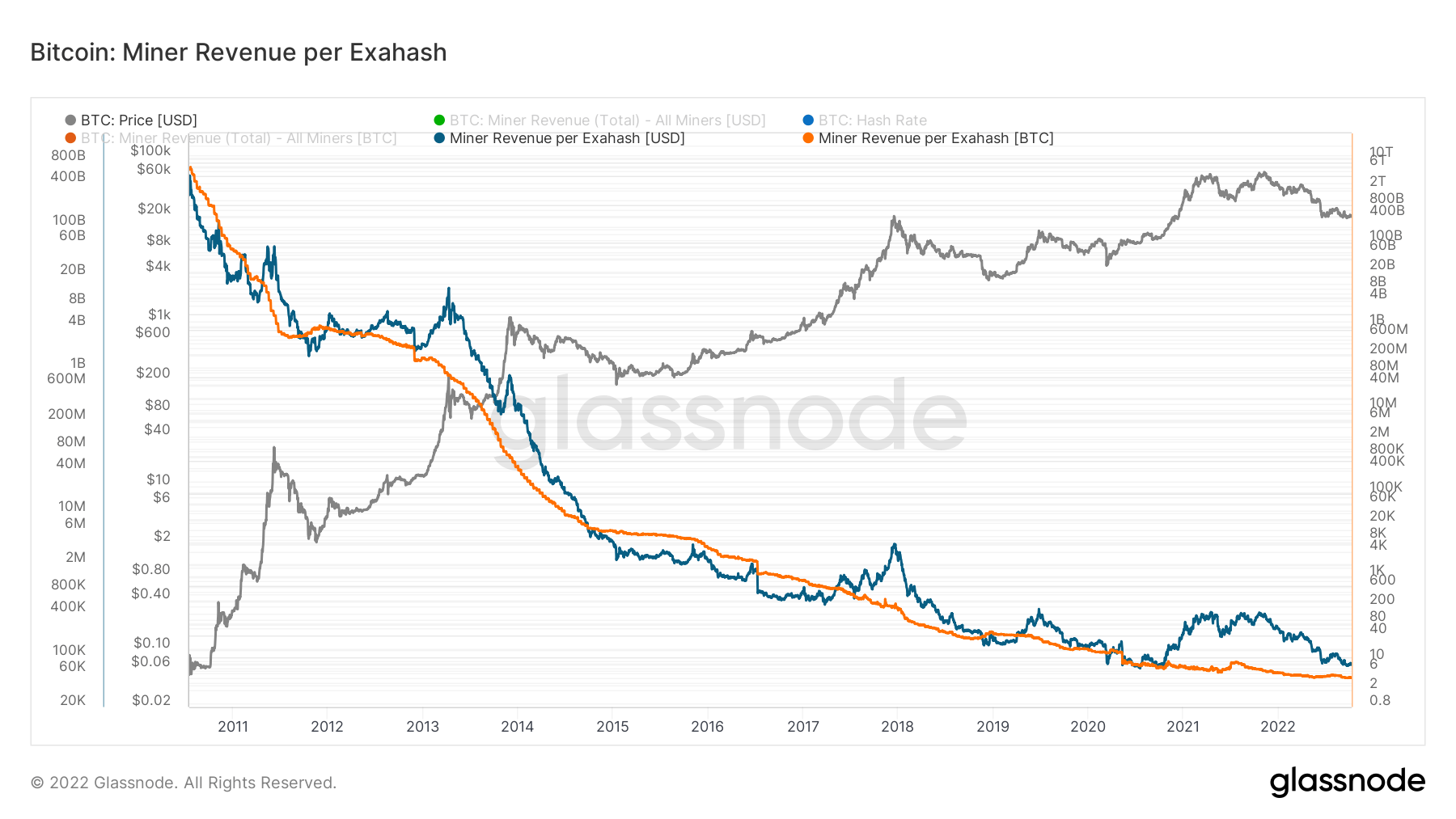 Looking at miner revenue per Exahash, a metric used to estimate daily miner income shows that miners all across the network are getting squeezed out of profits. Miner revenue per exahash shows the estimated daily profits for miners relative to their contribution to the network's overall hash power. It's calculated by dividing the ratio between total USD or BTC-denominated income by the current network hash rate.