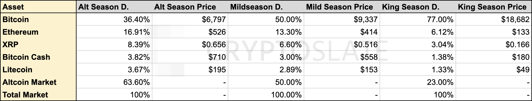 The “Alt Season Dominance” value is the lowest value for Bitcoin dominance during the 2017-2018 bear market and should be used as a maximum for projecting altcoin prices. Meanwhile, “King Season Dominance” somewhat arbitrarily uses the 77 percent dominance predicted by Atlanta Digital Currency Fund co-founder Alistair Milne.