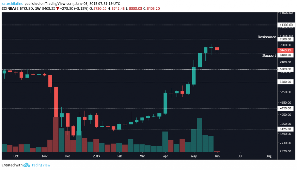 To the downside, a break below $8,200 could take BTC to the next support level at $6,800, $5,800 or even $4,350.