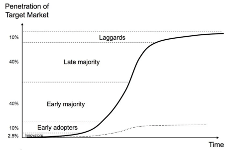 The late majority stage is reached when the technology becomes mainstream and is used in everyday objects. The last 10%, Laggards, refer to those who have been reluctant, or in a position that made them unable to accept the new technology. When these individuals or entities also integrate the technology in question the S curve reaches its peak.