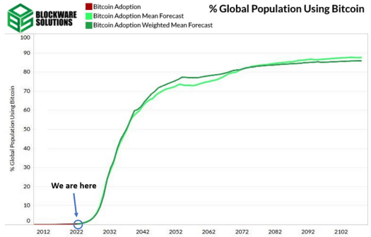 Bitcoin (BTC) is at the very early stages of its adoption and data indicates that it will enter its exponential growth phase and break past 10% adoption in the year 2030, according to blockchain infrastructure and bitcoin mining company Blockware Solutions' user adoption report.