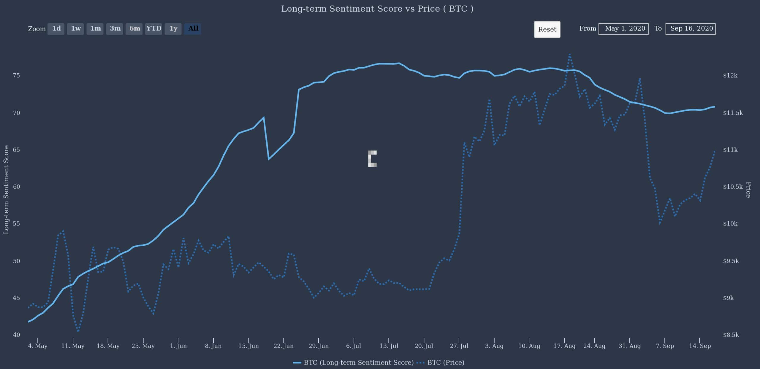 Sentiment remained stable even when Bitcoin suffered the infamous “Black Thursday” event in March when prices fell by over 45 percent over two trading sessions. However, public perception stably grew since, with prices catching on to reflect the metric.