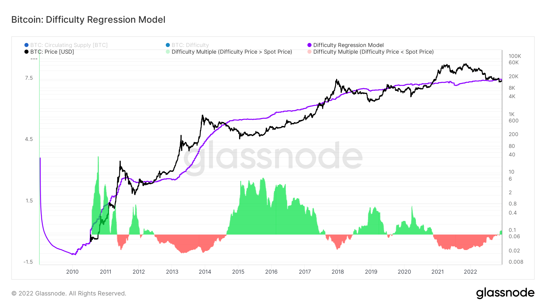 A few days after FTX filed for bankruptcy, Bitcoin's price went below the difficulty regression model and has remained there since.