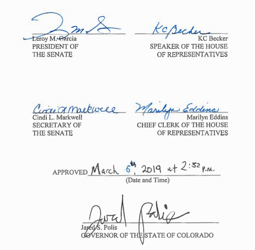 As of Mar. 6th, the bill was signed by the governor of Colorado, Jared Polis, State attorney general Phil Weiser, and president of the Colorado Senate Leroy Garcia.