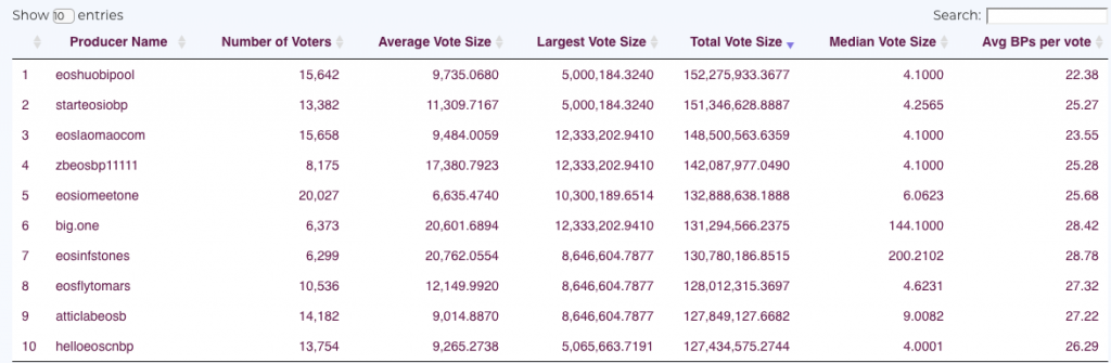 This is best illustrated through the example of the eosnewyorkio and eoshuobipool. The average vote size for eosnewyorkio is 4,247, but it ranks 20th on the BP list. The average vote size of eoshuobipool, which is currently the first BP producer on the list, is 9,851.