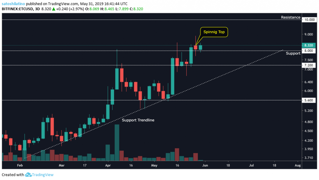 On the 3-day chart, a spinning top candlestick formed indicating that a correction may come. If ETC retraces, it could try to test the $7.2 level, the support trendline or even the major support given by the $5.6 price point.