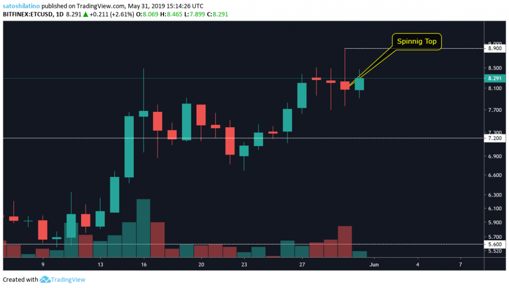 A spinning top candlestick can also be seen on the 1-day chart predicting a pullback that could take ETC to $7.2. The bearish pattern will be invalidated if this cryptocurrency is able to trade above the recent high of $8.9.