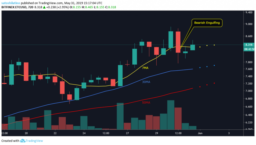 A bearish engulfing candlestick formed on the 12-hour chart. At the moment, ethereum classic is trading above the 7 MA which is a bullish sign, but if the bearish formation is validated this cryptocurrency could go down to test the 30 or 50 MA. It will be wiser to wait for a move above the previous high before entering a bullish trade.