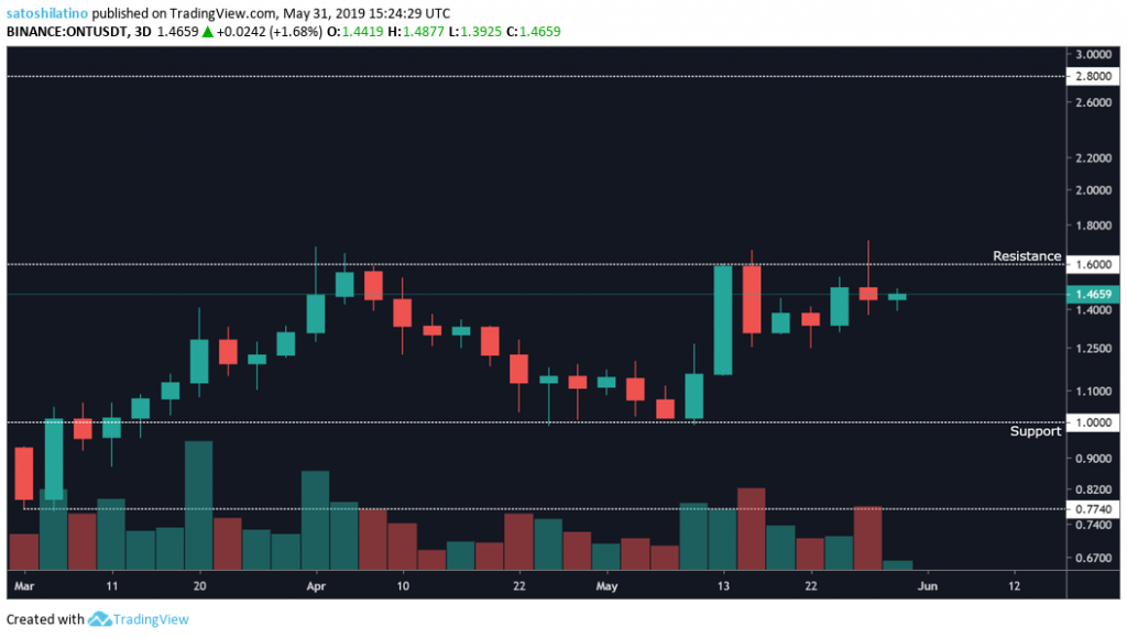Currently, this cryptocurrency is trading around the $1.6 resistance level signaling that it could drop to the $1.0 support once again. If volume starts picking up, however, ONT could experience a bullish impulse that takes it all the way up to $2.8, which is where the next point of resistance sits.