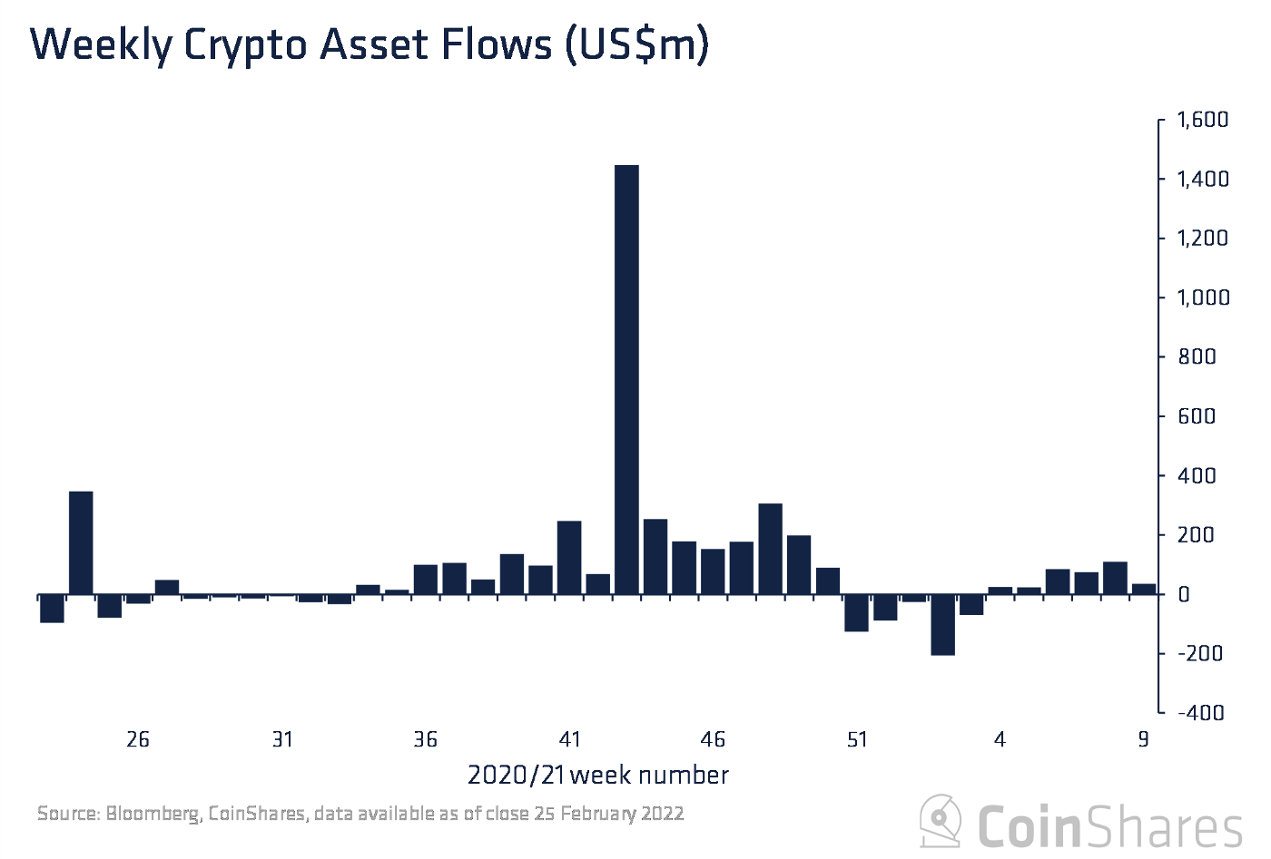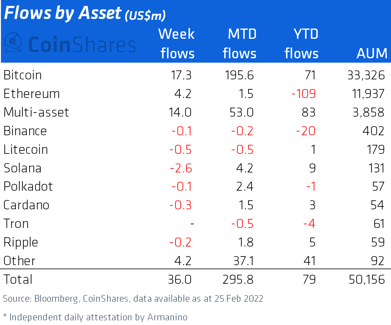 Despite the raging conflict in Eastern Europe, crypto investment products saw inflows totaling $36 million in the week ending February 28, according to the latest report by institutional crypto fund manager CoinShares.