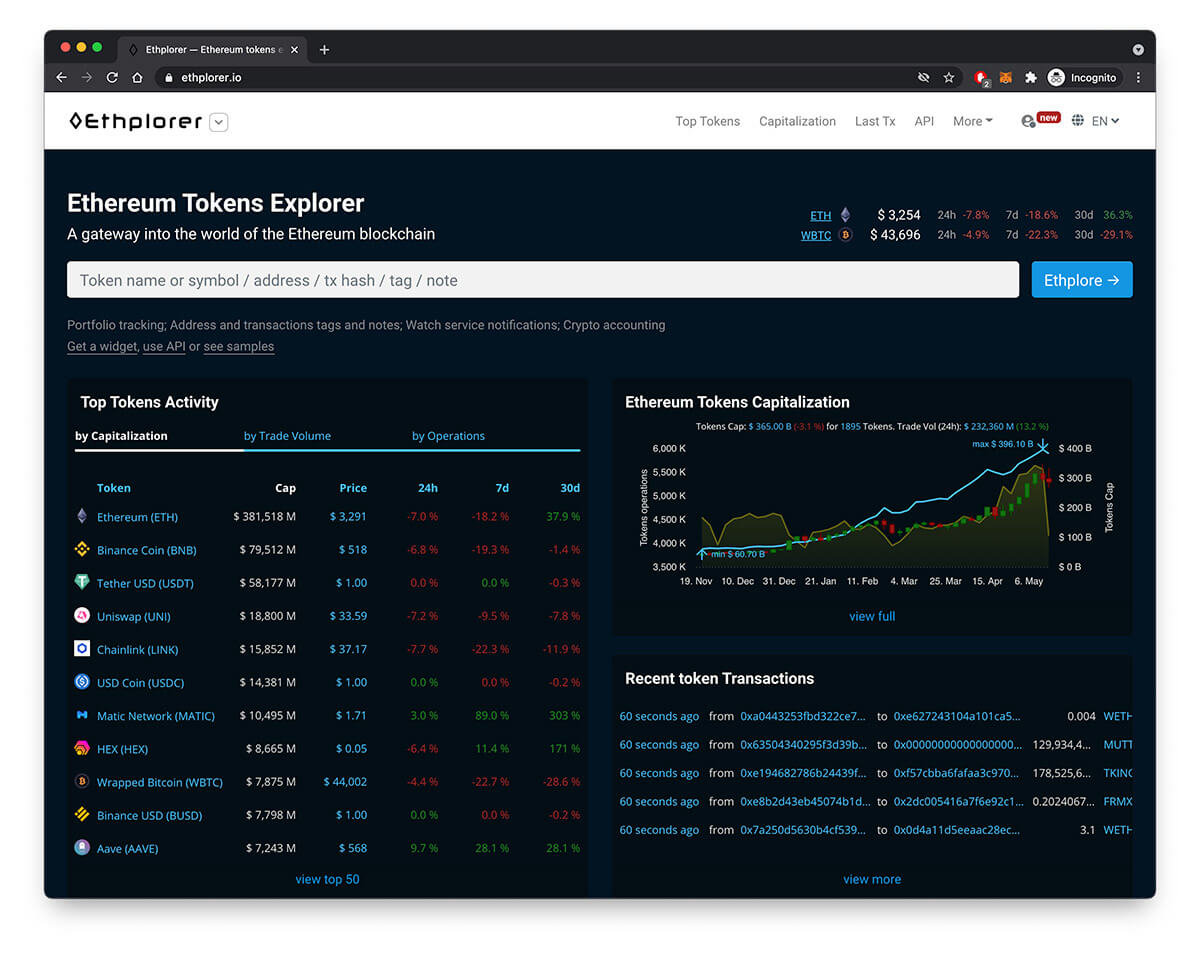 When the Berlin Hard Fork went live on Ethereum in April 2021, it caused a lot of other Ethereum explorers and platforms that operate on OpenEthereum to crash as nodes went down across the network. Ethplorer, however, remained unaffected by the upgrade as the platform doesn’t solely run on OpenEthereum. Easily accessible, Ethplorer allows users to track ERC tokens in real-time as well as compare the growth of various tokens over 24-hour, weekly, and monthly time periods.