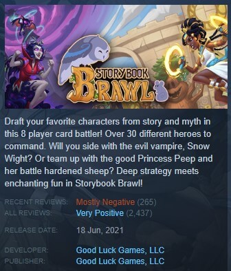Popular steam game Storybook Brawl is moving to FTX Gaming after the acquisition of their parent company Goodluck Games. Reviews of the game tanked as the news broke.