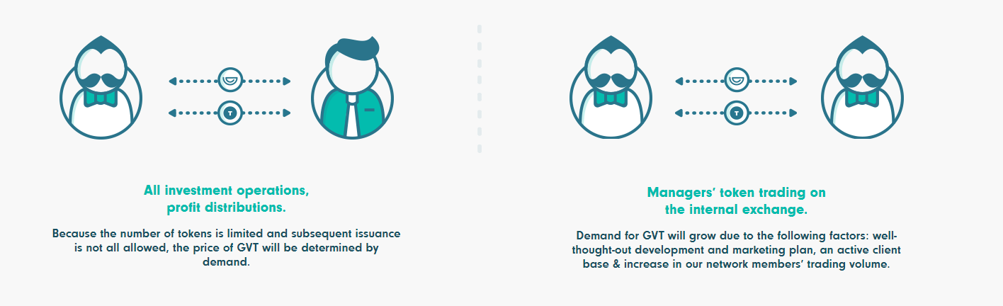 Genesis Vision uses ERC20 standard “Genesis Vision Tokens” on the Ethereum blockchain as a utility token, which is used for all investment operations, profit distributions, and, importantly, “manager token” trading. Manager tokens are a vital element of the Genesis Vision project — each manager using Genesis Vision can issue their own cryptocurrency, which is purchased by investors.