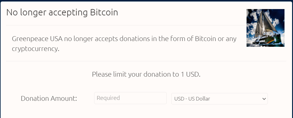 “Greenpeace USA no longer accepts donations in the form of Bitcoin or any cryptocurrency,” says the donation page on BitPay.