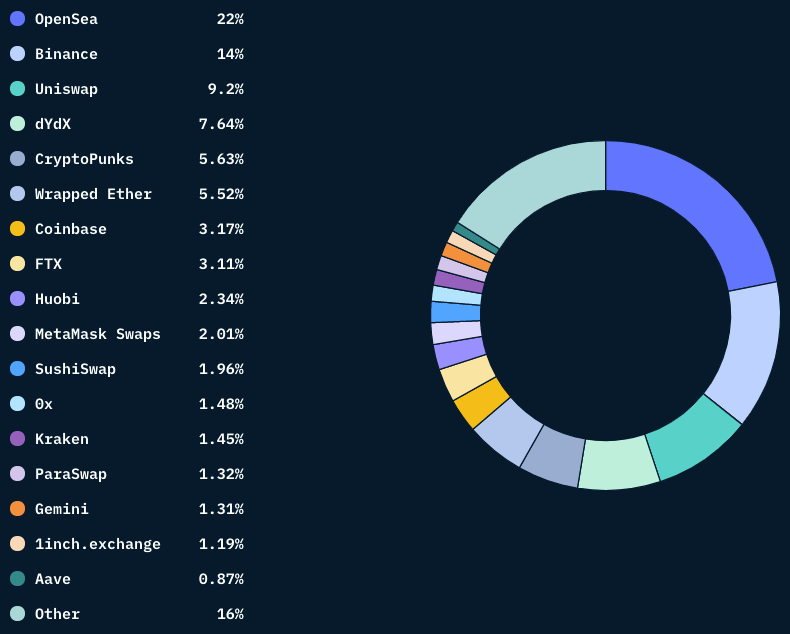 Examining the ETH flow in more detail reveals that almost 22% of the sales flow is returned to OpenSea. When it comes to deposits onto centralized exchanges, Binance tops the list with 14%, while Coinbase and FTX have each captured just over 3%.