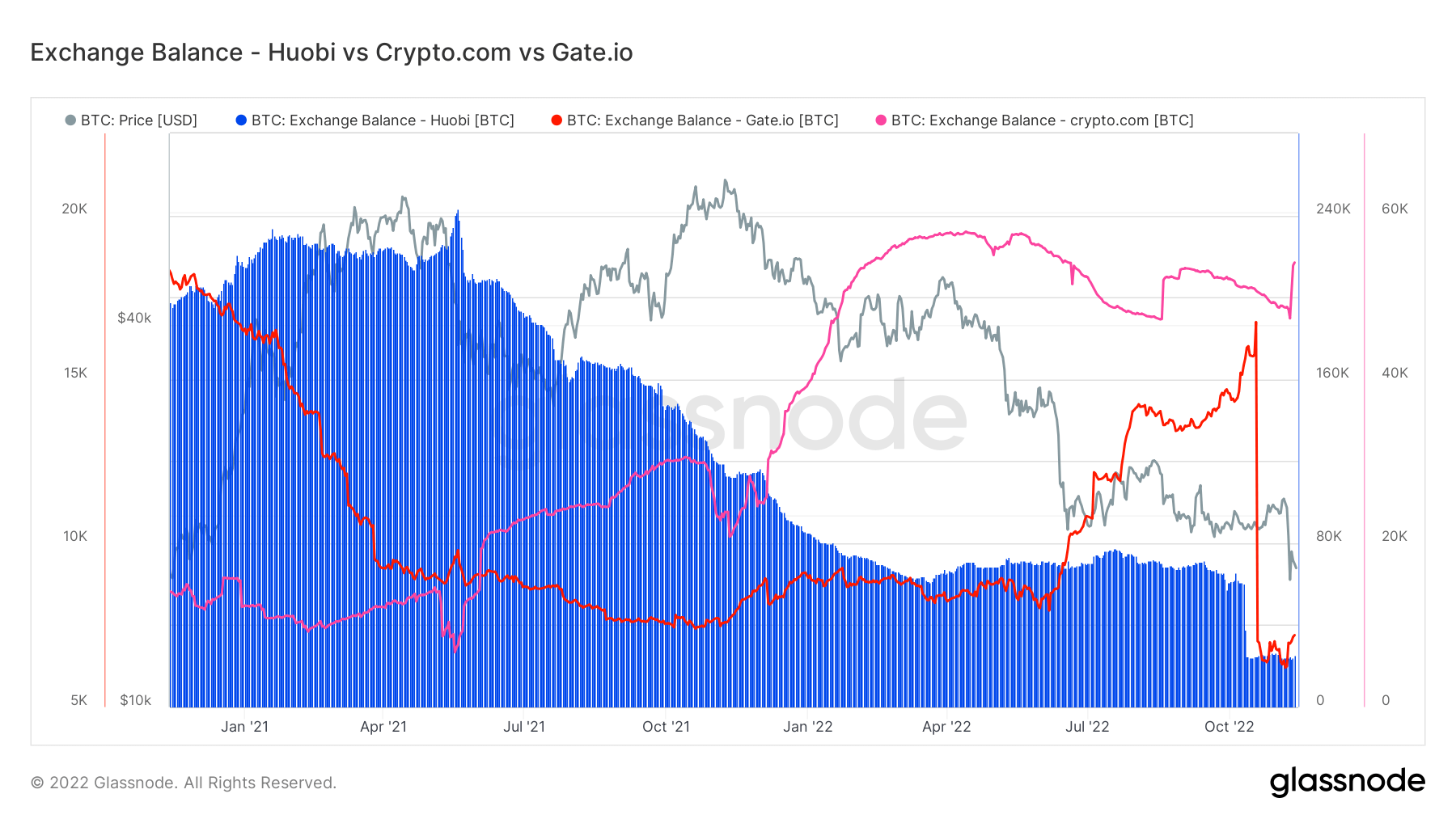 While the sharp drop in Bitcoin balances we've seen in the past week can be attributed to the FTX fallout, three exchanges stand out in particular — Huobi, Gate.io, and Crypto.com.