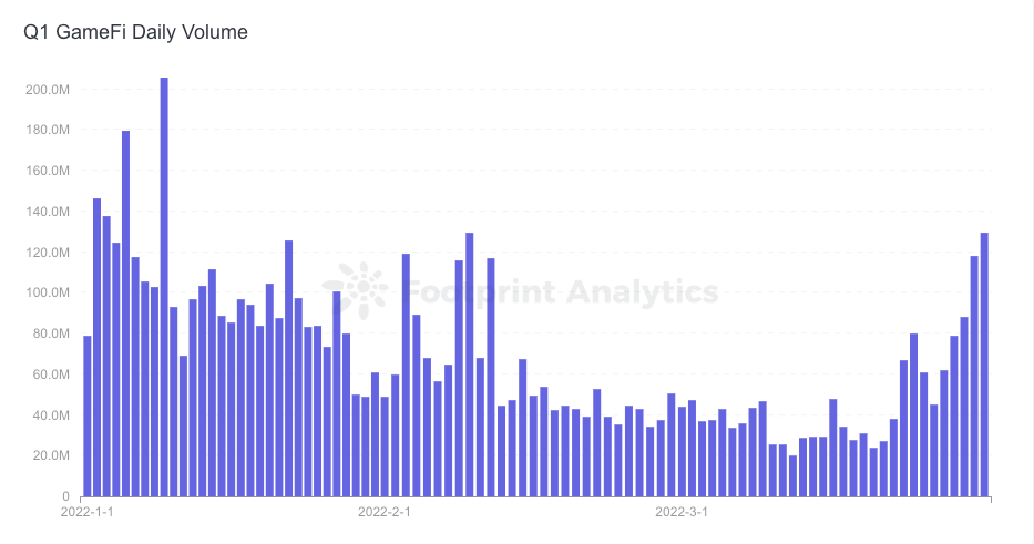 The total trading volume GameFi recorded in the last quarter reached $6.3 billion, with the highest trading volume of $200 million recorded on January 9th. However, daily trading volume failed to reach these numbers by the end of the quarter, recording an average daily trading volume of around $40 million from mid-February to mid-March.