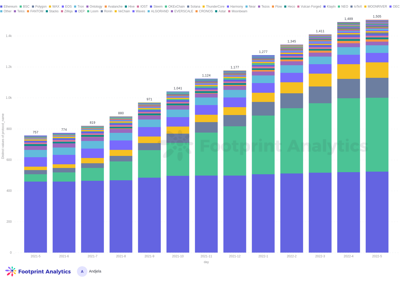 Hive blockchain occupied the second spot with 225 million transactions, or just under 12% of the overall number, while Binance Smart Chain accounted for just 2% of the overall transaction number.