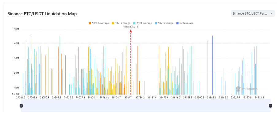 There's a substantial grouping of potential liquidations that stands out just below the $30,000 benchmark, stretching as low as $29,000. What's especially remarkable about these liquidation levels is the intense level of leverage used, which could be as high as 50 to 100 times.