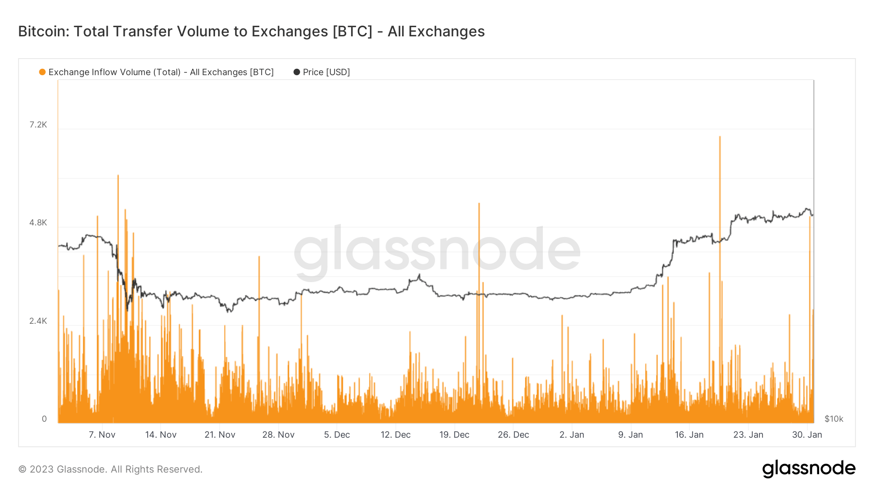- Roughly 10,000 BTC was sent to exchange addresses on Jan. 30