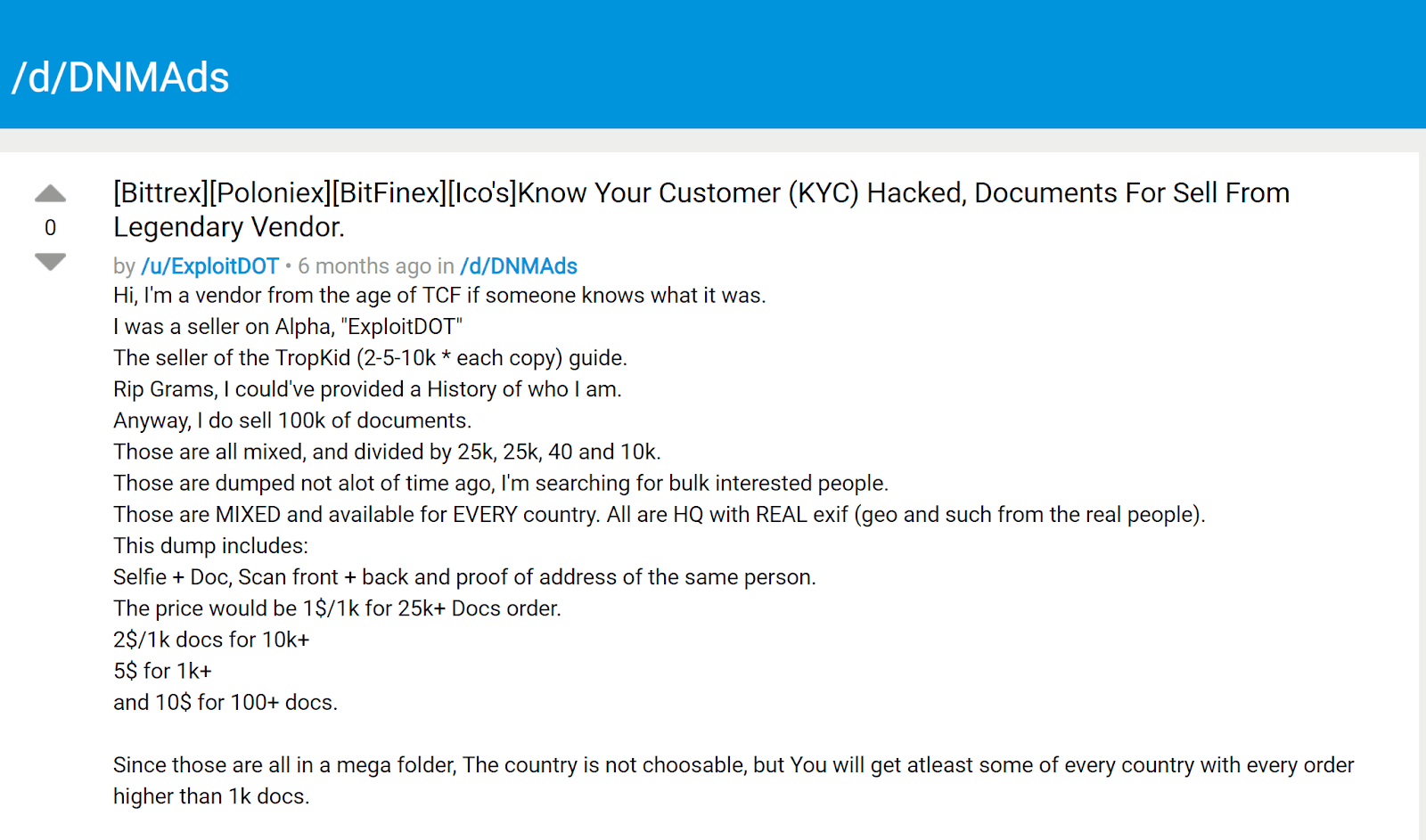 On darknet market Dread, a vendor going by ExploitDOT was reported to have been selling KYC data from exchanges in a sub-community (/d/DNMAds). The post suggested that the data came from larger exchanges such as Bittrex, Poloniex, and Bitfinex.