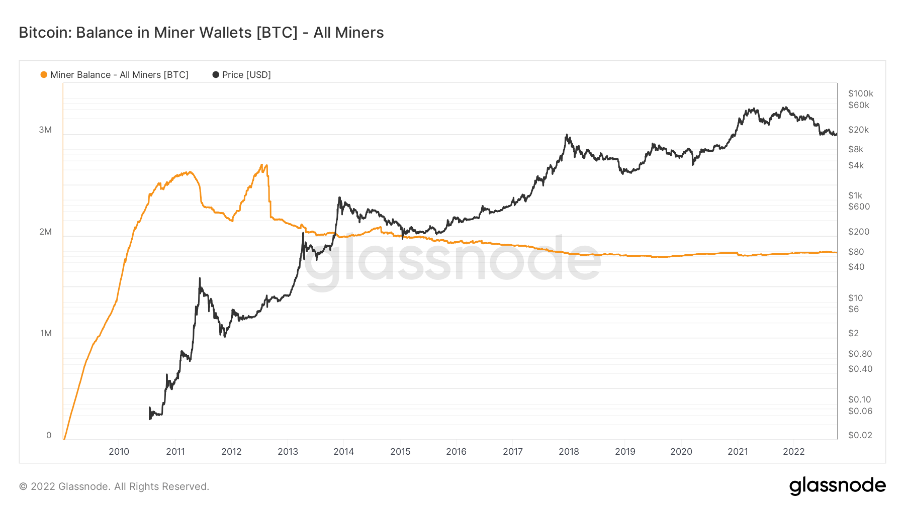 Miner balance is at its lowest point in Bitcoin terms since 2010. This is the power that proof of work gives, steadily creating an equal distribution of the currency across time.