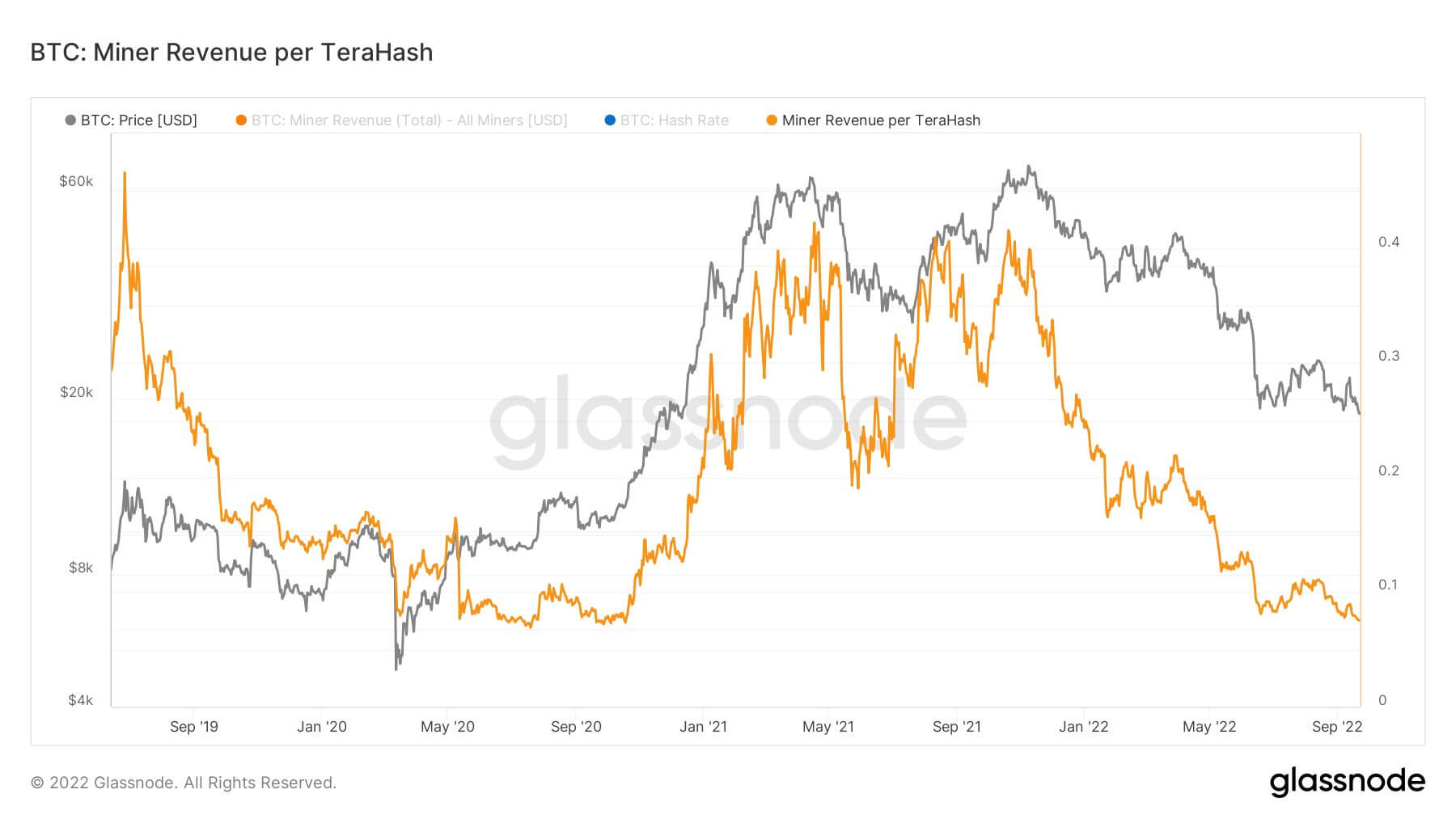 In addition, miner revenue per TeraHash (hash rate/ miner revenue) hasn’t broken down below its all-time lows, which has the potential to happen due to rising hash rate and BTC falling prices.