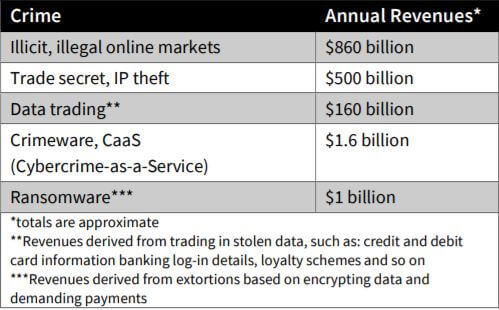 Cybercrime is generating at least $1.5 trillion dollars in revenue every year via illicit online markets, IP theft, crimeware, and ransomware. In some cases, cybercrime revenues exceed those of some legitimate companies.