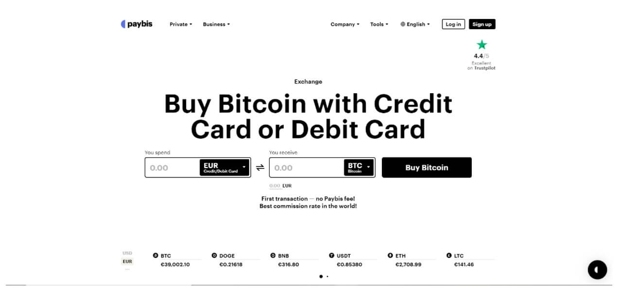 The Paybis exchange offering is one of its private business services available to individuals who want to purchase Bitcoin (BTC), Ethereum (ETH) or other altcoins. With the service, any qualified user can use both credit or debit cards to buy the coins of their choice. The first trade here may require the buyer to complete some necessary Know-Your-Customer (KYC) checks and there is no commission charged for the first trade.