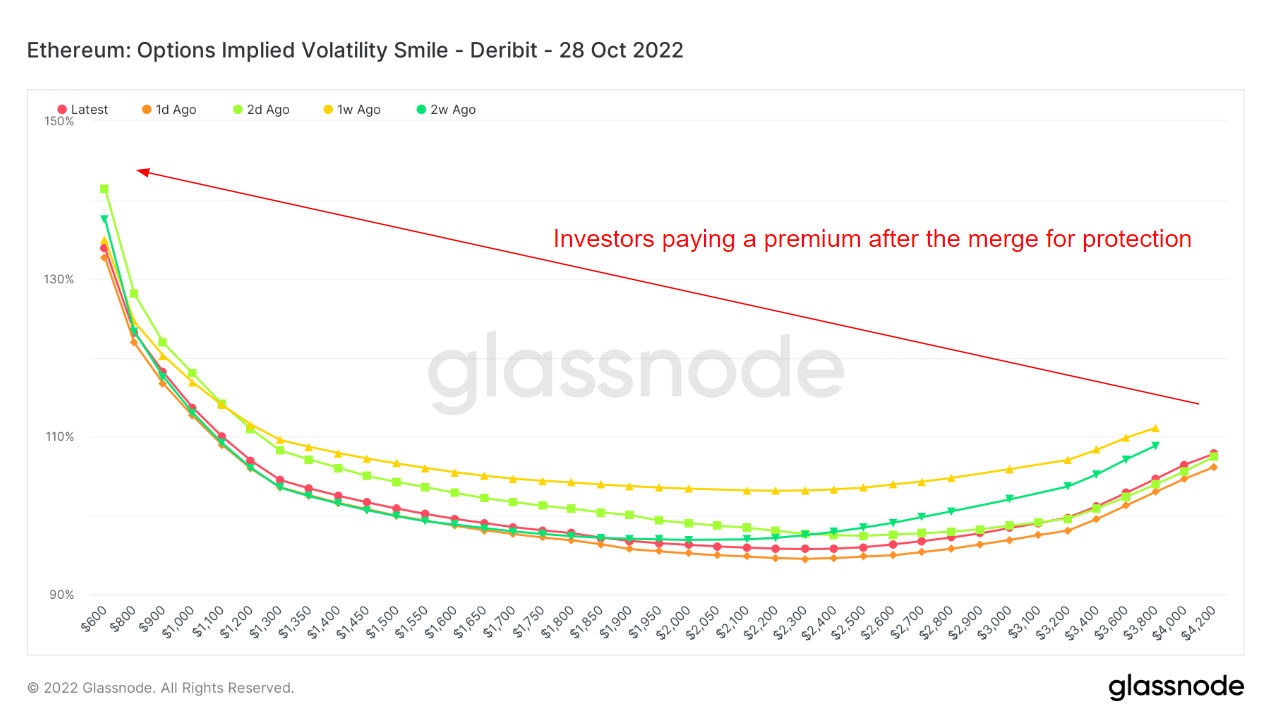 Nonetheless, the left tail is still high for implied volatility, implying traders are willing to pay a premium for put options after the Merge.