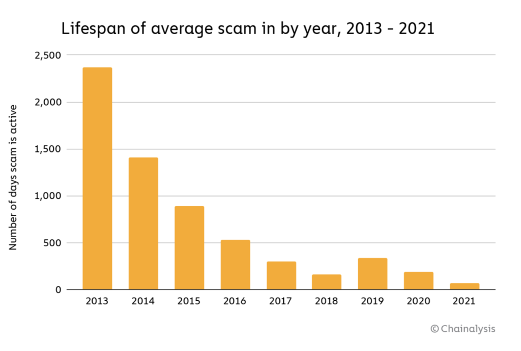 The report noted that the average lifespan of financial scams continued to be shortened, which could explain why “the number of financial scams active at any point in the year–active meaning their addresses were receiving funds–rose significantly in 2021, from 2.052 in 2020 to 3.300.”