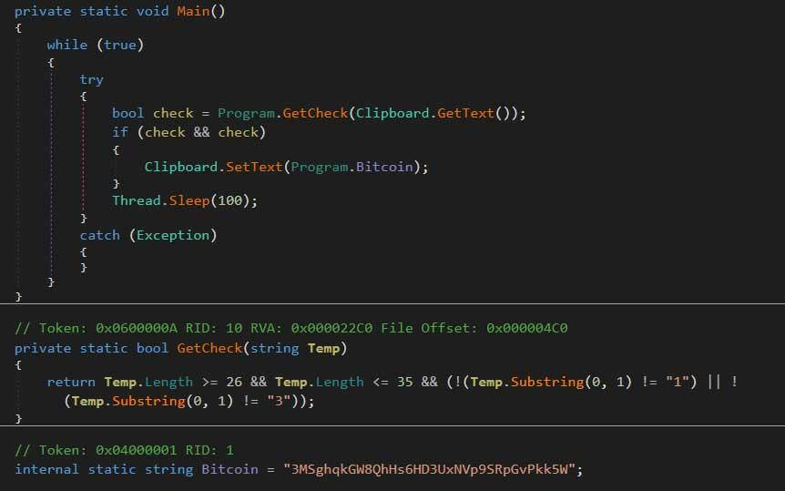 In the case of the Task.exe malware, the program monitors the user's clipboard for Bitcoin addresses. If the program detects one, it replaces with 3MSghqkGW8QhHs6HD3UxNVp9SRpGvPkk5W, which is an address owned by the attacker.