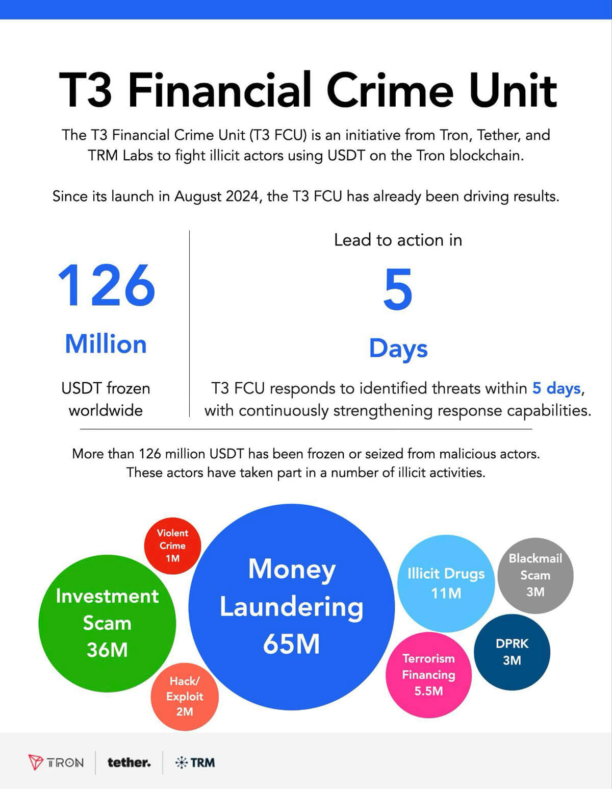 January 2, 2025 – The T3 Financial Crime Unit (T3 FCU), a collaboration between TRON, Tether, and TRM Labs, has frozen more than USDT 100 million in criminal assets globally, passing a significant milestone in its fight against cryptocurrency-related financial crime.