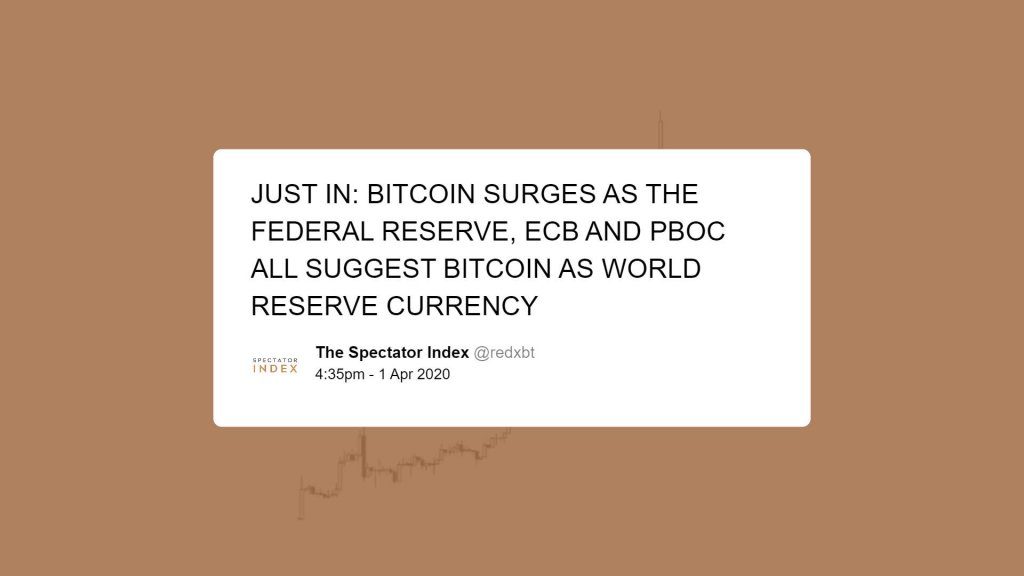 What wasn't disappointing, though, was news from the totally real account of news aggregator The Spectator Index, which announced that the Federal Reserve, European Central Bank, and the People's Bank of China — three of the world's most powerful monetary authorities — all simultaneously ‘suggested' that Bitcoin, not Toilet Paper Token, should be the world's next reserve currency.