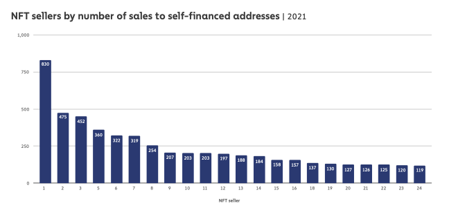 Analysis of these sales showed that some NFT sellers have conducted hundreds of wash trades. The most prolific NFT trader on the chart above made 830 sales to self-financed addresses last year but has so far failed to turn a profit.